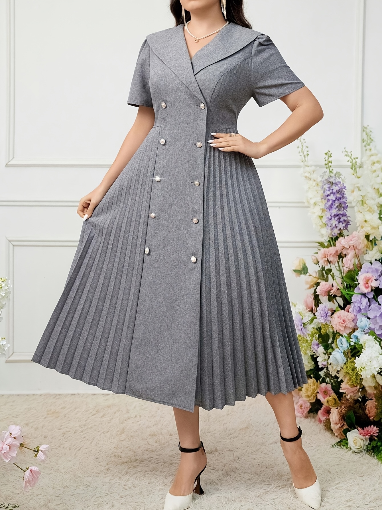 Elegant Pleated Midi Dress, Polyester 95% Spandex 5% Blend, Short Sleeve Tunic with Contrast Lapel Collar, Loose Fit Solid Color, Non-Stretch Fabric, Spring/Summer Casual Weekend Wear
