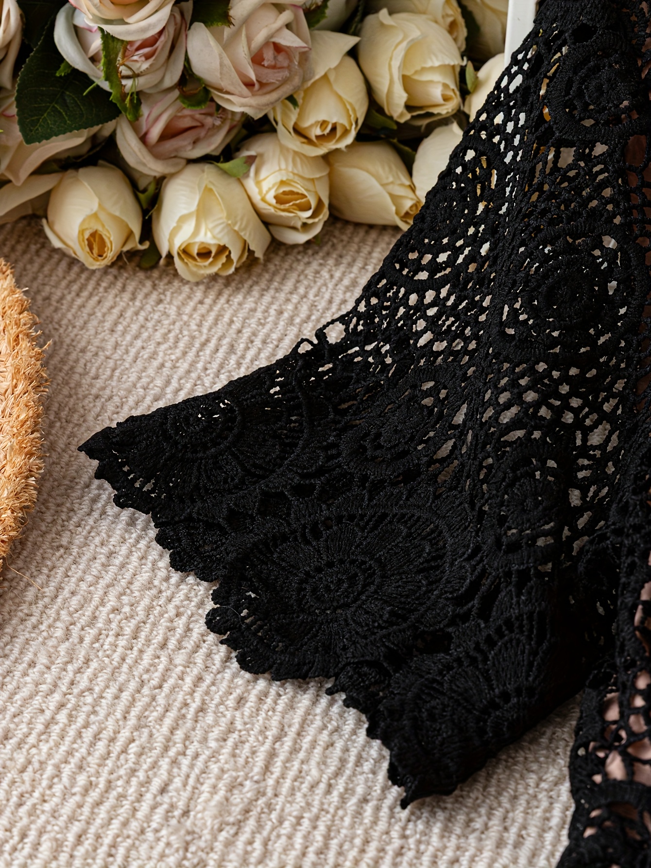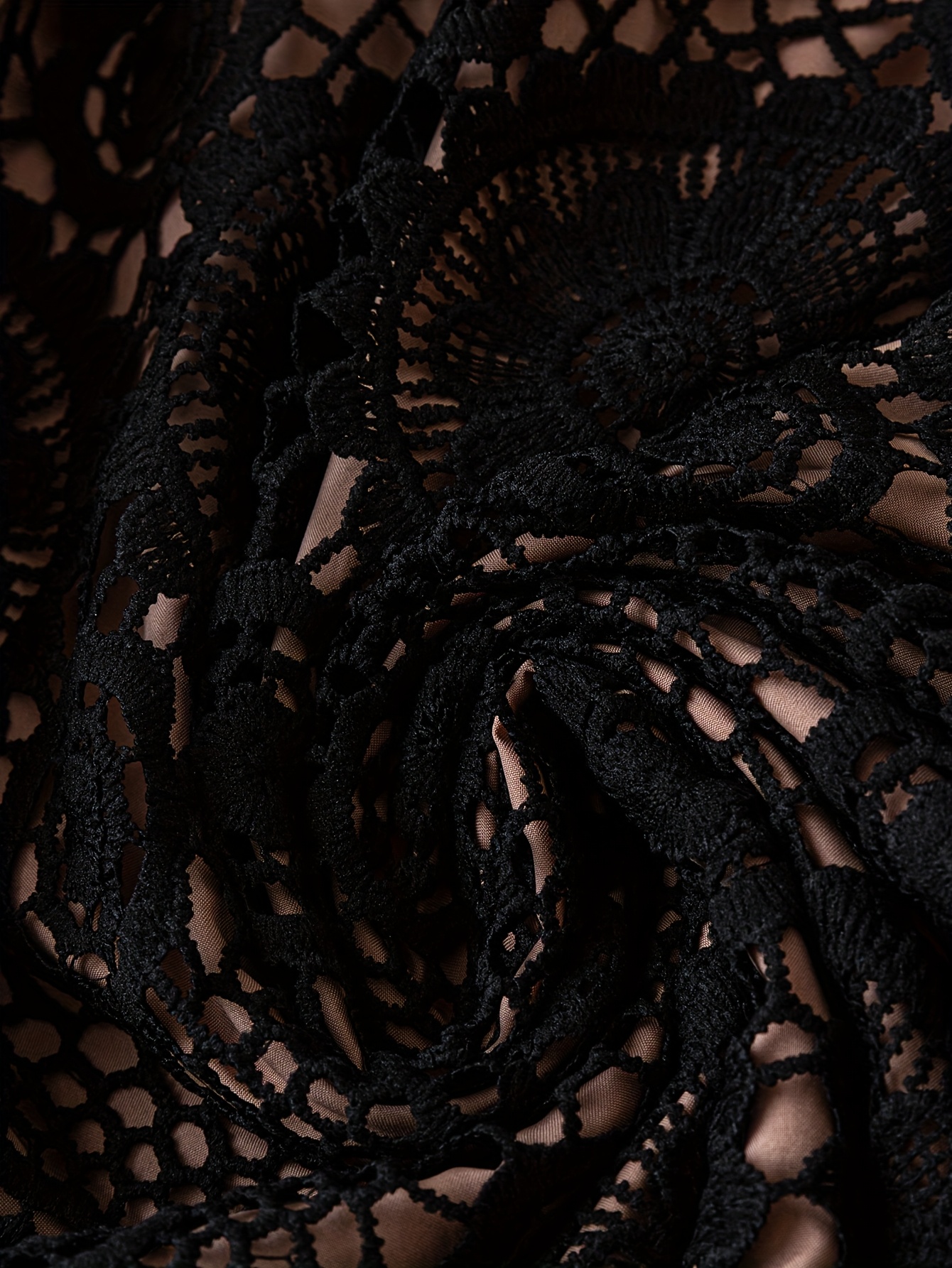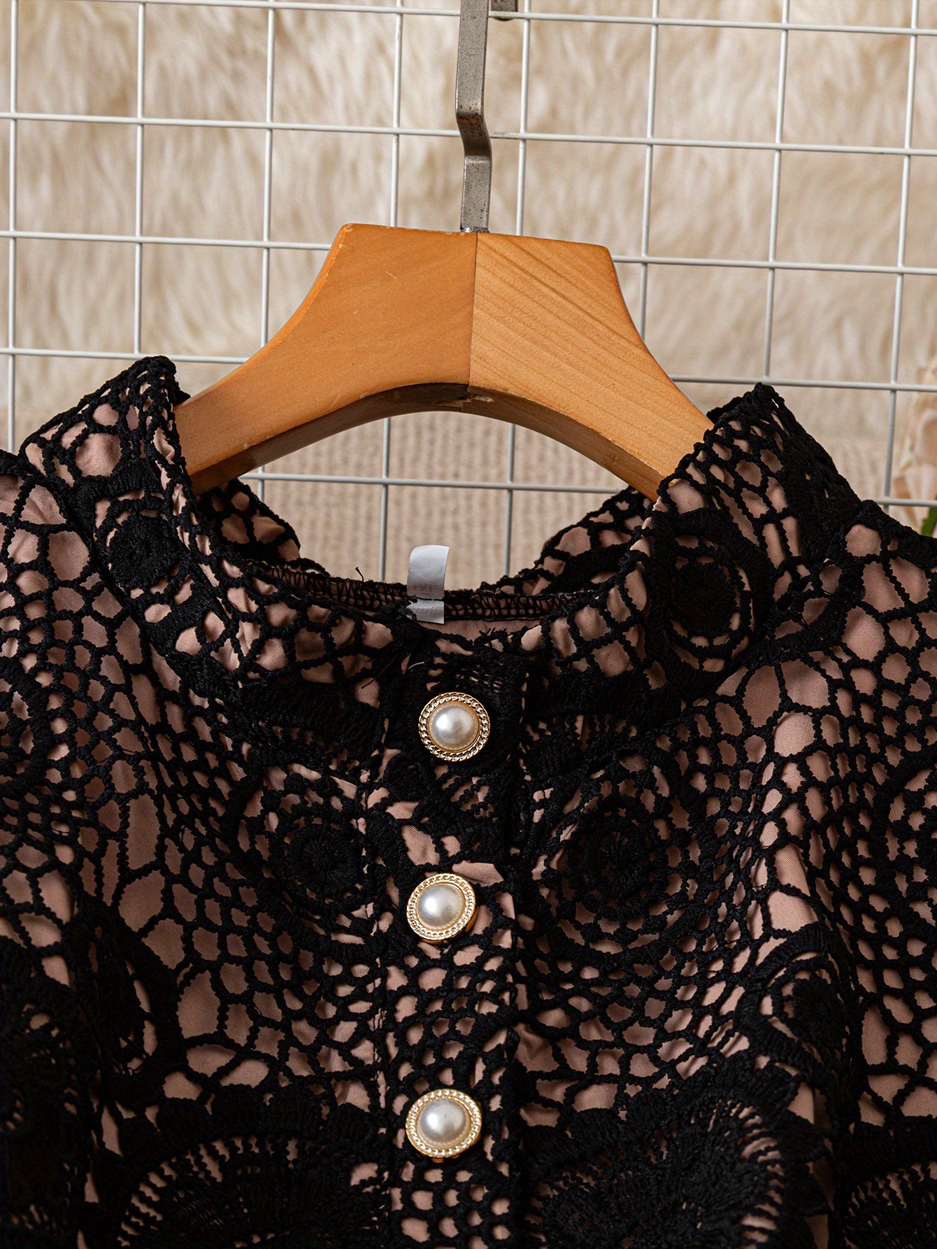 Plus Size, Women's Elegant Short Sleeve Round Neck Lace Detail A-Line Midi Dress with Button Front Closure & Elastic Waist - Machine Washable Solid Color Plus Size Party & Casual Dress