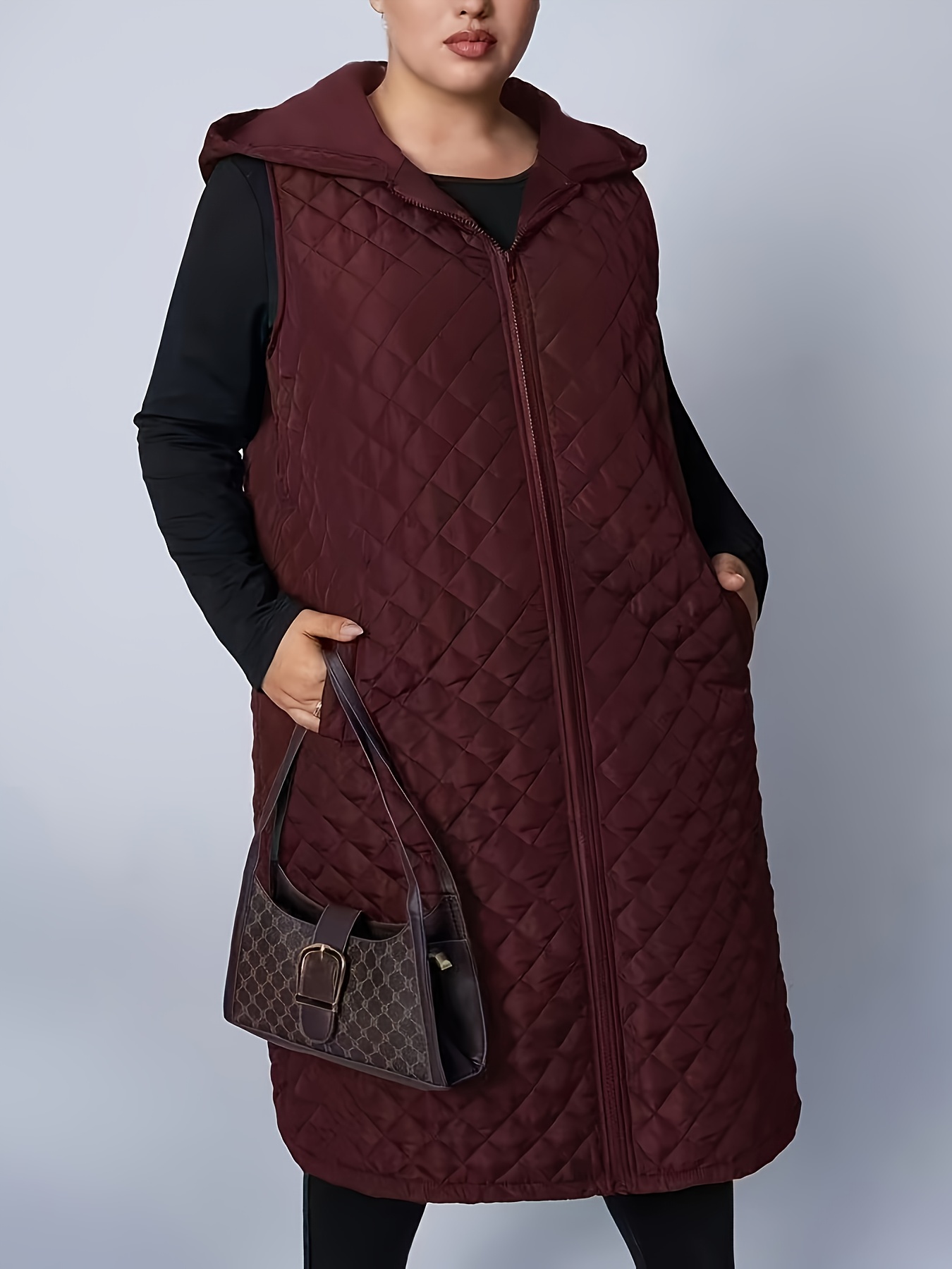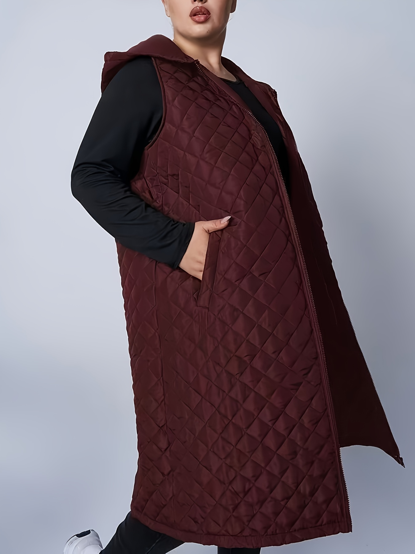 Plus Size, Women's Oversized Burgundy Hooded Vest - Thickened Long Sleeveless Coat with Full-Zip Closure, Machine Washable Winter Warmth, Elegant Casual to Formal Outerwear for Fall & Winter (Plus Size Available) - Solid Burgundy Coat for Women, Knee-Length Design, Relaxed Fit, Chic Hooded Style, Versatile Layering Piece for Casual Attire, Winter Vest for Women Plus Size, Plus Size Coats, Sleeveless Jacket for Women, Womens Curve Winter Vest, Vest for Women Winter