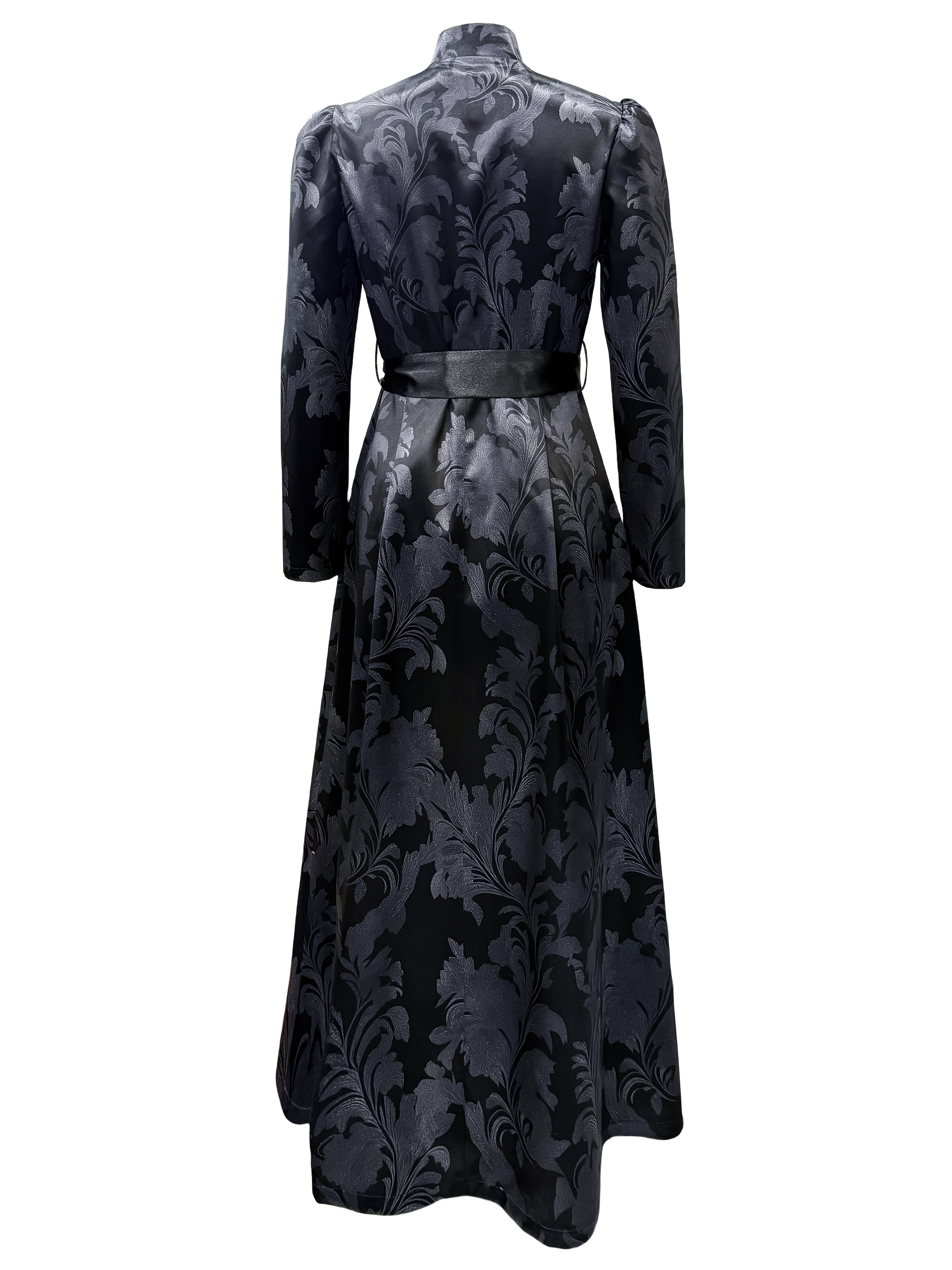 Plus Size, Women's Plus Size Black Floral Jacquard Satin Long Sleeve A-Line Stand Collar V Neck Dress