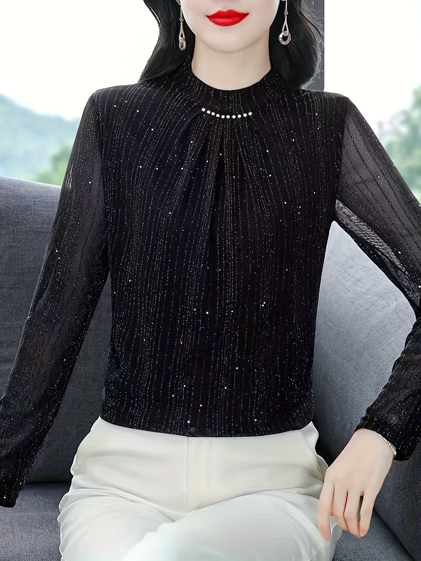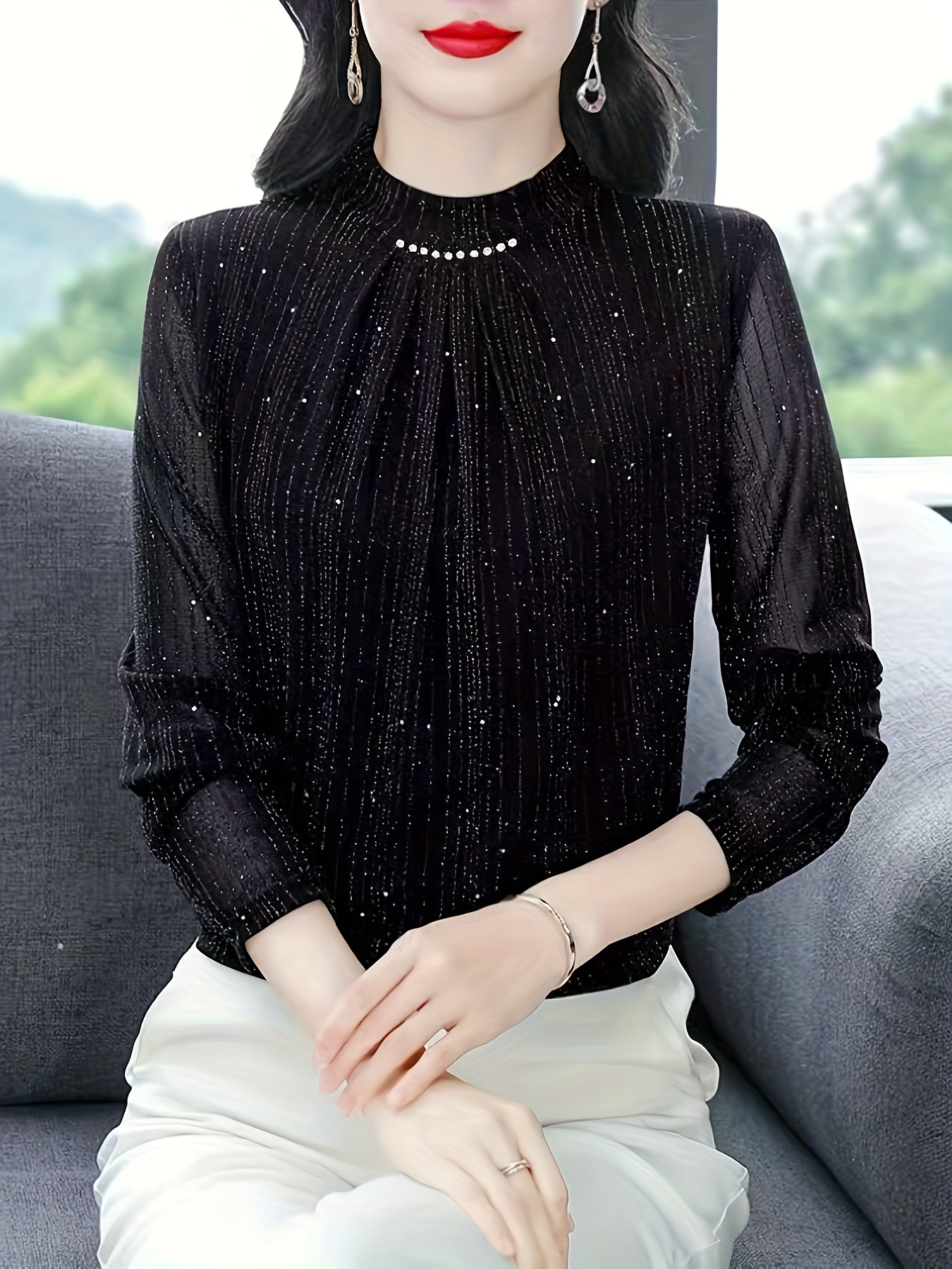 Plus Size, Women's New Winter Plus Size Mesh Shiny Hand-Set Diamond Turtleneck Long Sleeve Top