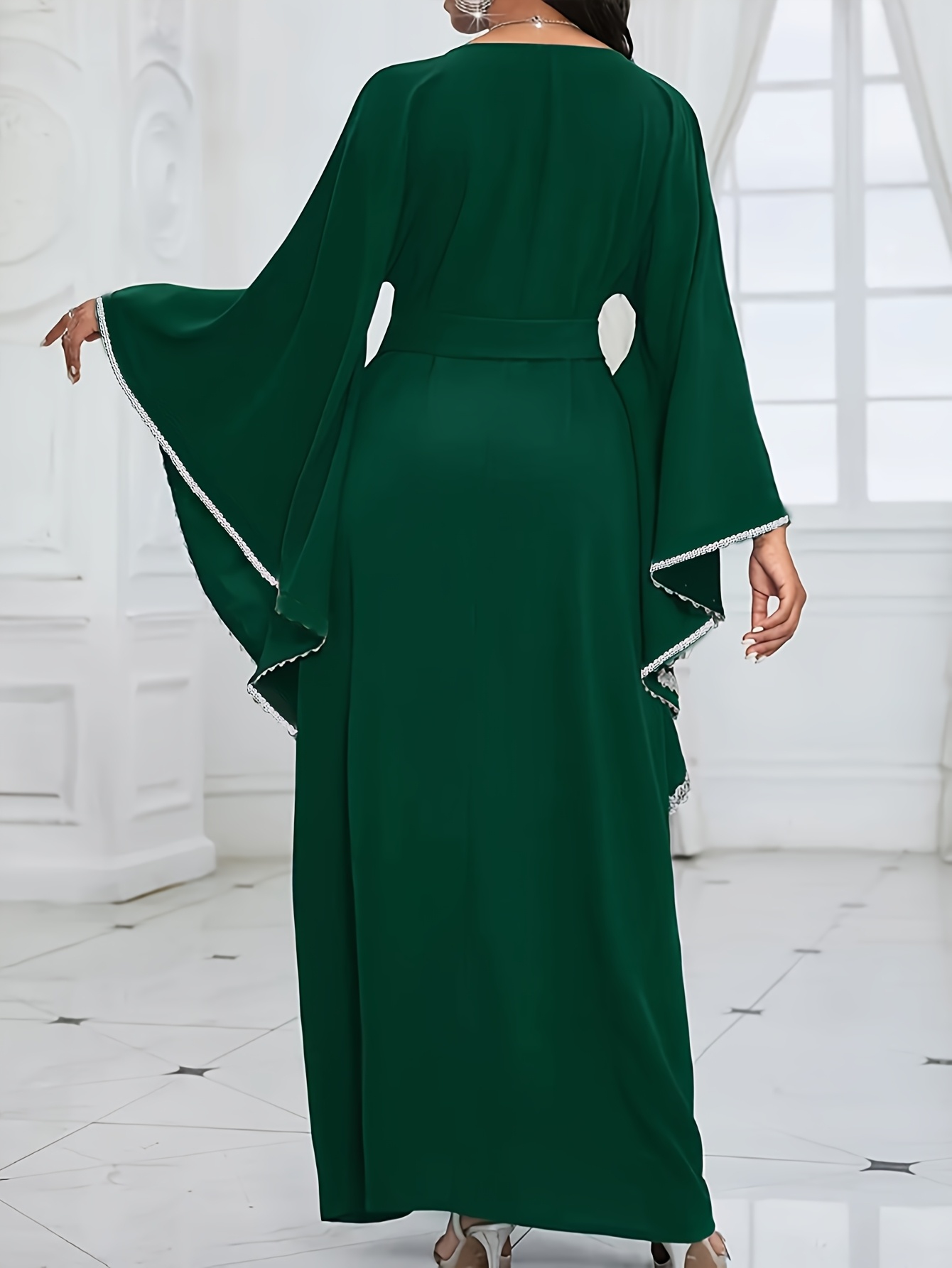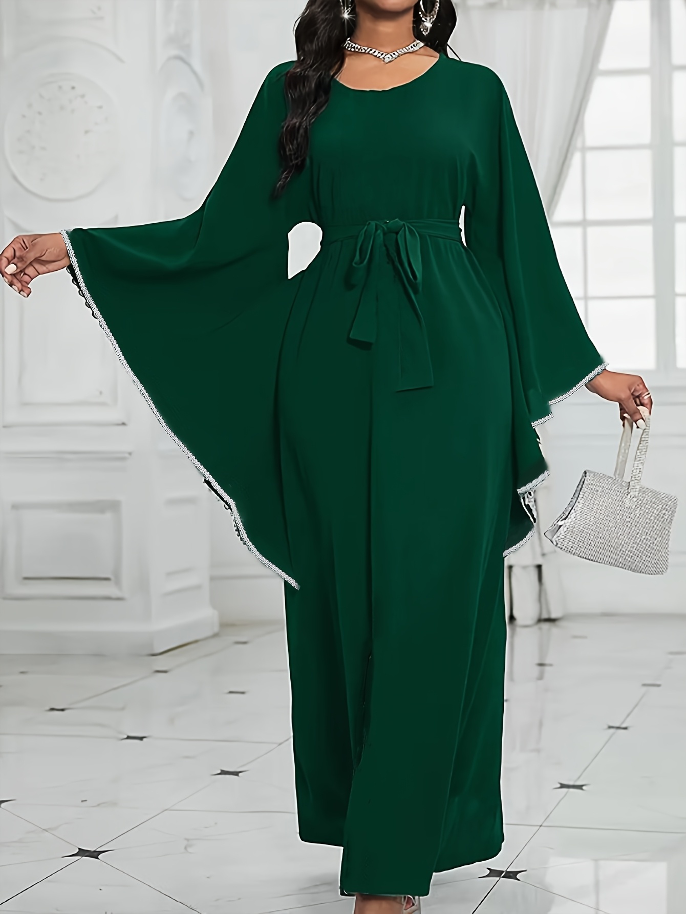 Elegant Plus Size Women'S Long Dress - Solid Color Green, Crew Neck, with Belt and Shoulder Sleeves, Flowing Design for Spring/Fall, Polyester Fabric, Casual Elegance | Belted Waist Dress | Glossy Textur