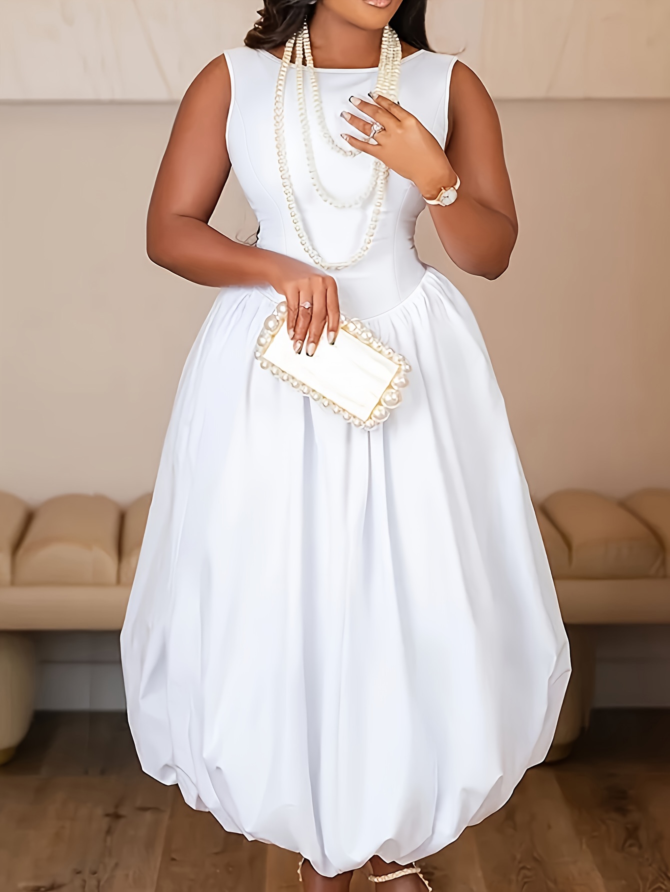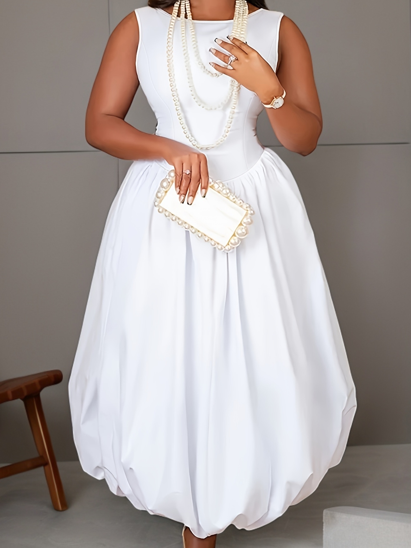 Plus Size, Women's Elegant Sleeveless Round Neck Formal Party Mini Dress - A-Line Silhouette with Flared Skirt, Machine Washable White Evening Gown for Weddings, Proms & Special Occasions, All-Season Wear