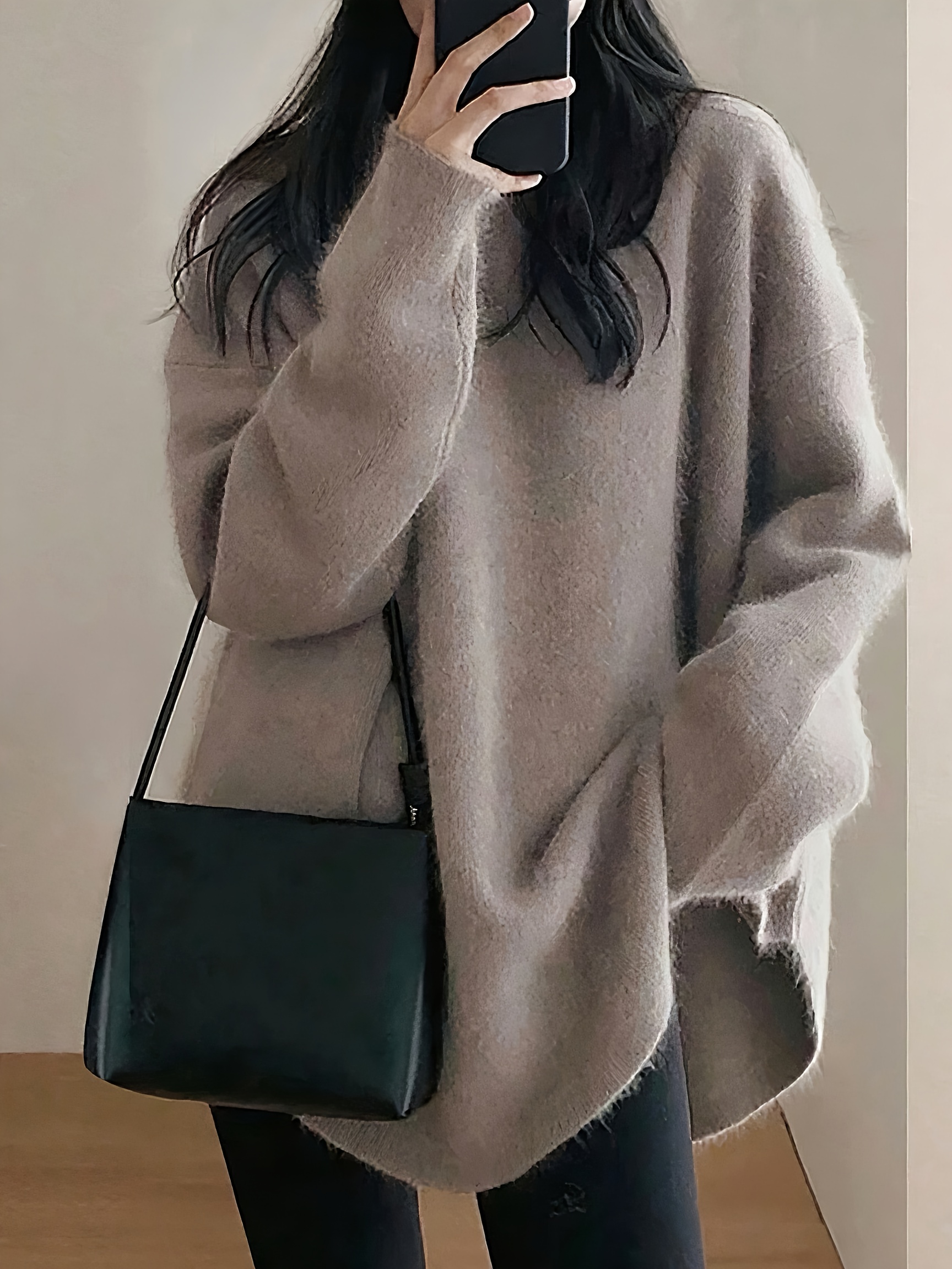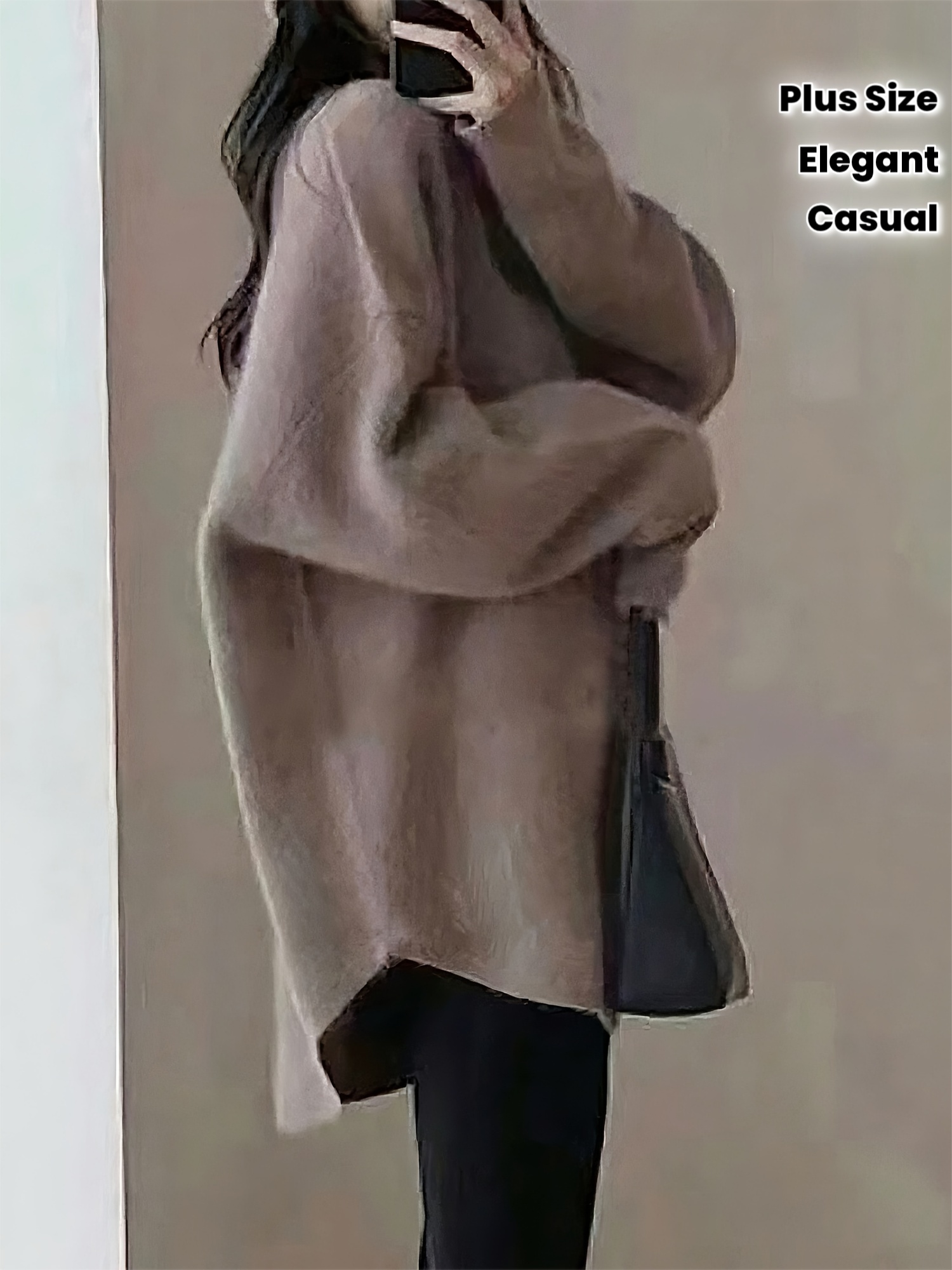 Plus Size, Women's Elegant Oversized Beige/Brown Sweater Coat - Soft Round Neck Collar Pullover, Winter Warm Blazer-like Jacket for Casual & Professional Wear, Hand Washable Fall/Winter Outerwear (No Pattern)