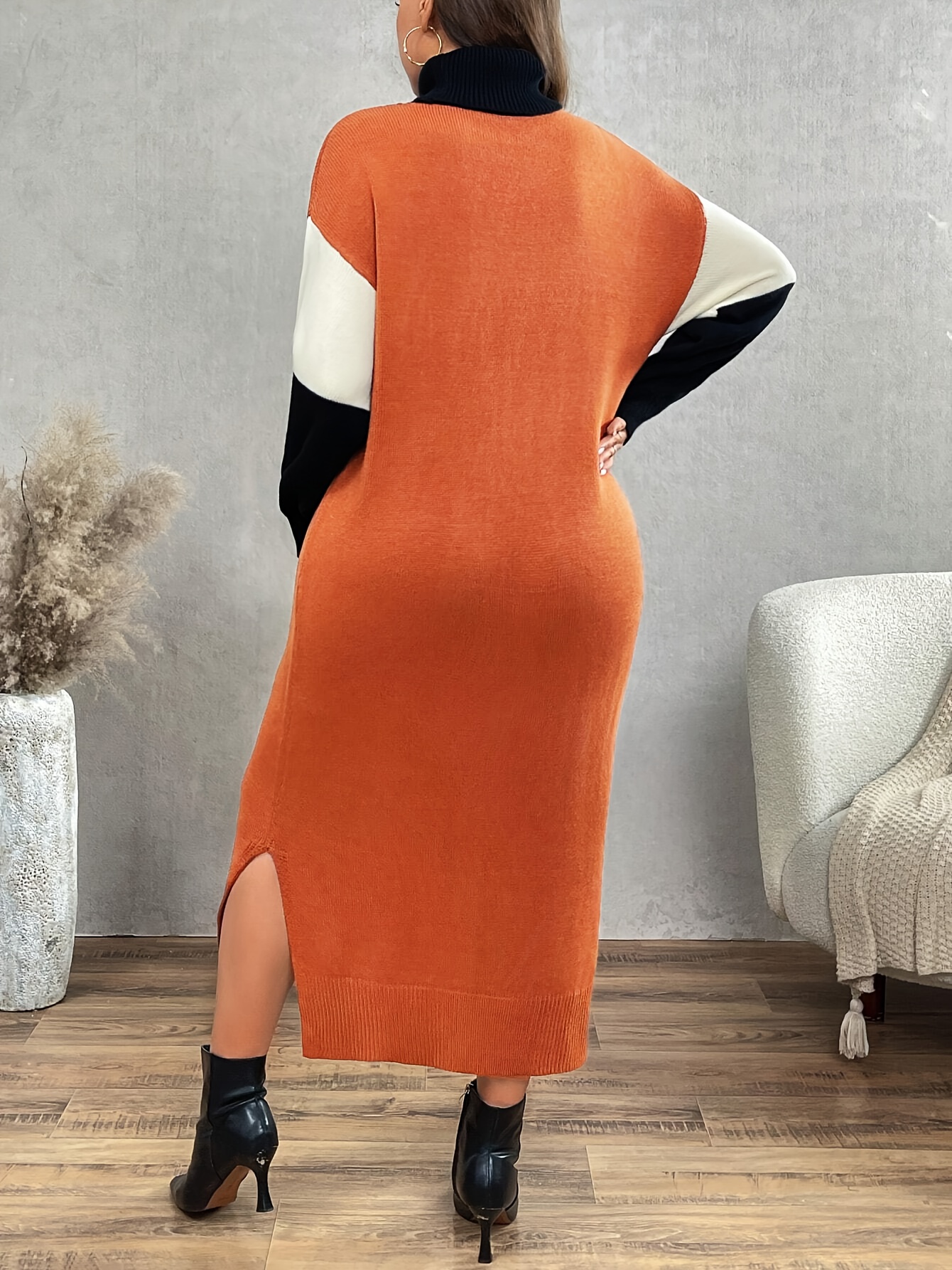 Plus Size, Women's Oversized High-Neck Sweater Dress - Casual Elegant Color Block (Olive Green/Black/White) A-Line Silhouette with Long Sleeves, Cozy Fall Winter & Spring Layering Dress for Plus Size Women, Hand Washable