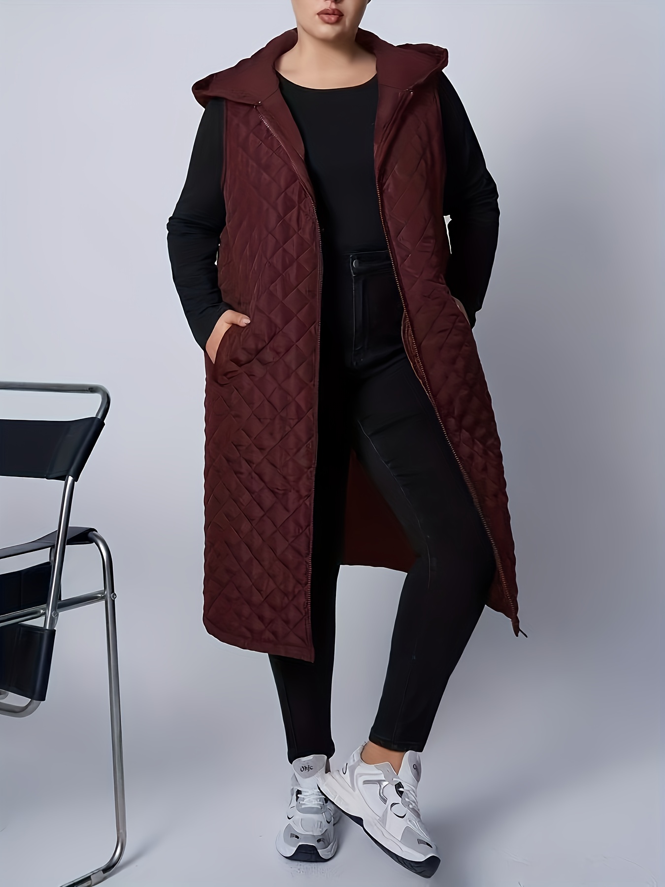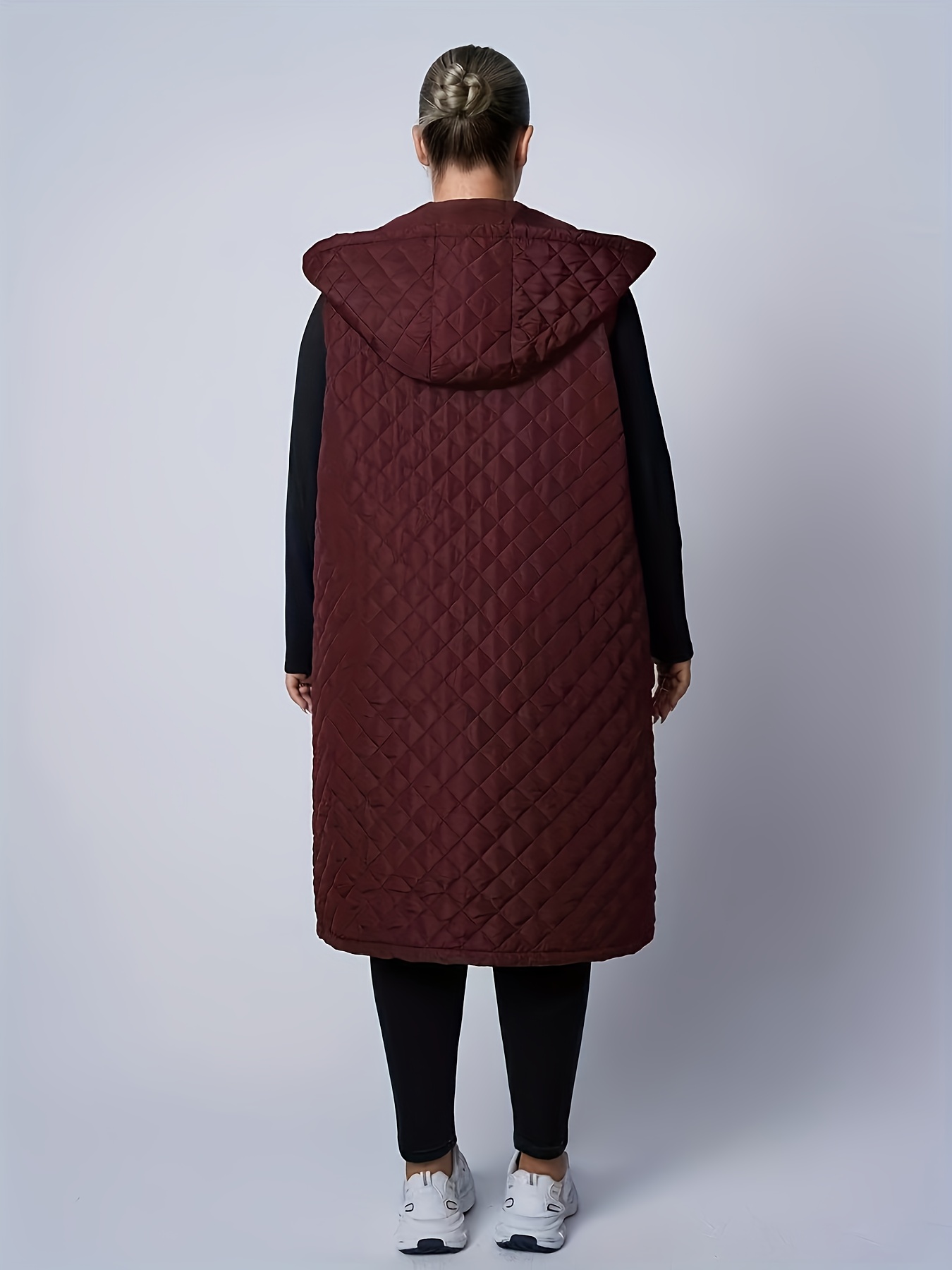 Plus Size, Women's Oversized Burgundy Hooded Vest - Thickened Long Sleeveless Coat with Full-Zip Closure, Machine Washable Winter Warmth, Elegant Casual to Formal Outerwear for Fall & Winter (Plus Size Available) - Solid Burgundy Coat for Women, Knee-Length Design, Relaxed Fit, Chic Hooded Style, Versatile Layering Piece for Casual Attire, Winter Vest for Women Plus Size, Plus Size Coats, Sleeveless Jacket for Women, Womens Curve Winter Vest, Vest for Women Winter