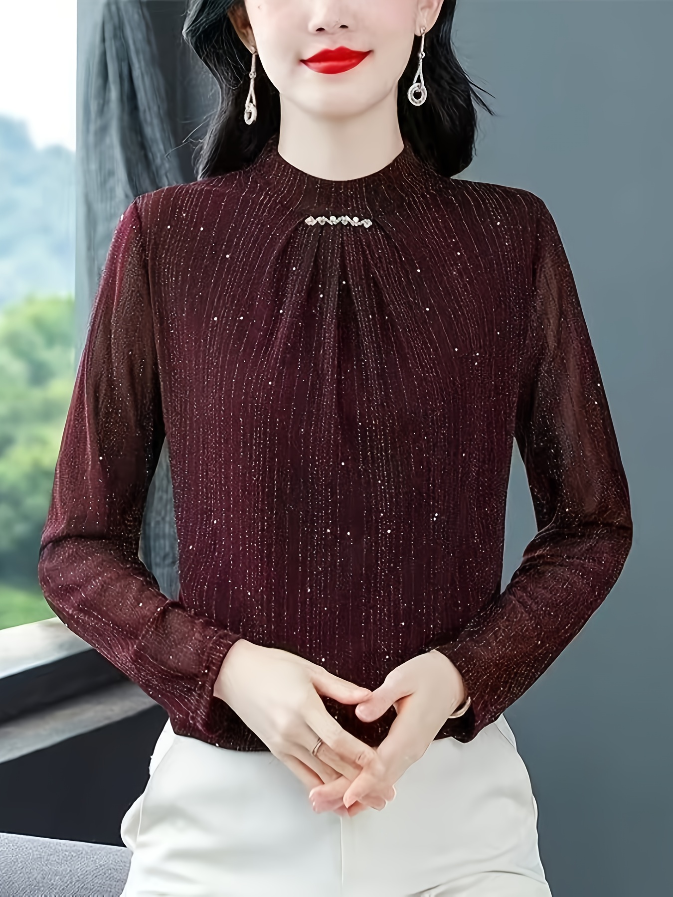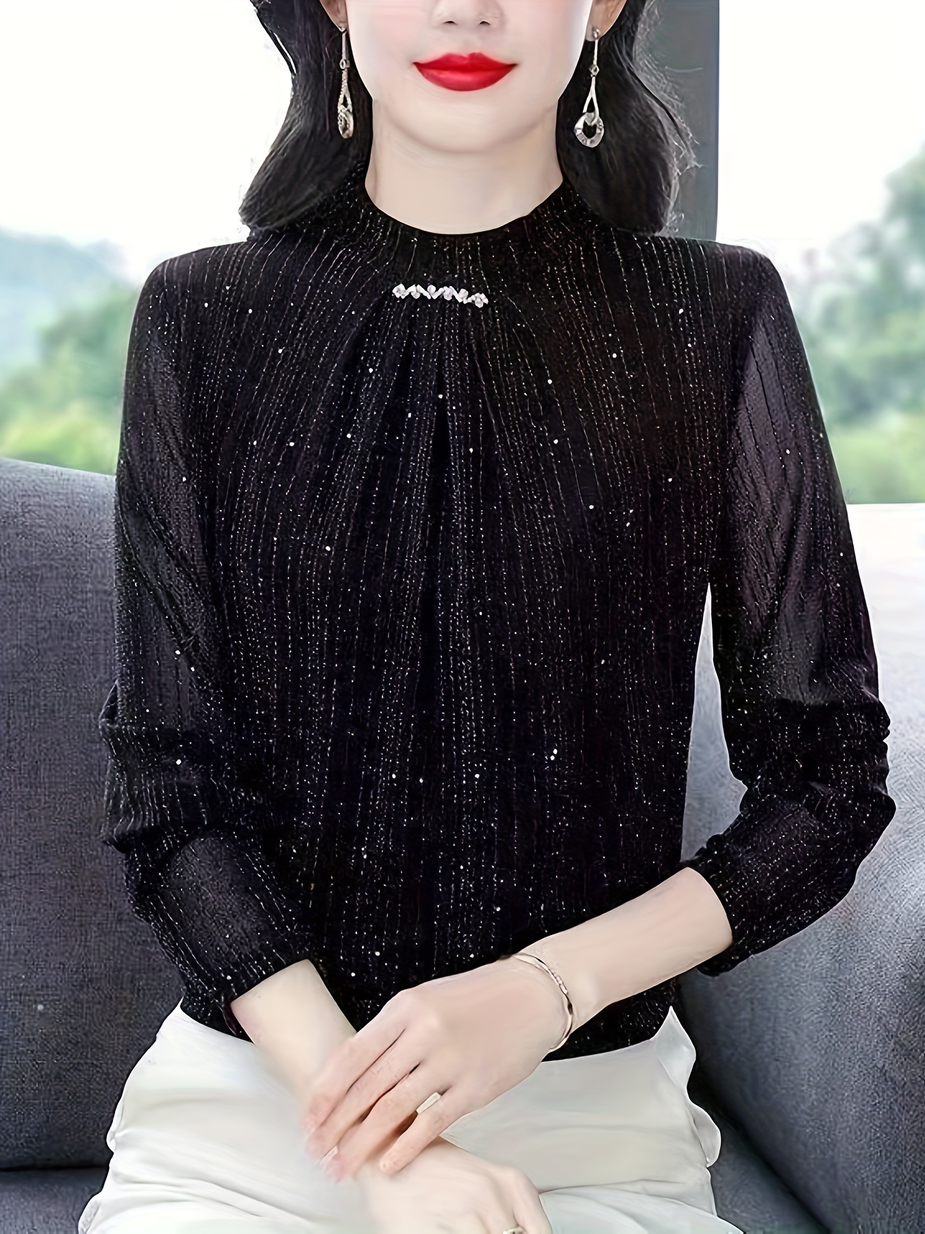 Plus Size, Women's New Winter Plus Size Mesh Shiny Hand-Set Diamond Turtleneck Long Sleeve Top