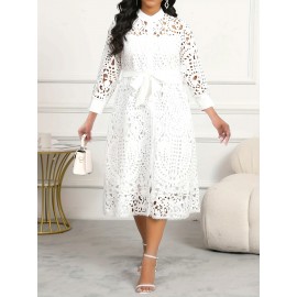 Elegant White Lace Midi Dress with 3/4 Sleeves and Belt Detail, Button-Up Front, Breathable Fabric, Perfect for Casual or Semi-Formal Occasions, Lace Dress, Occasion Wear, Nontransparent Fabric