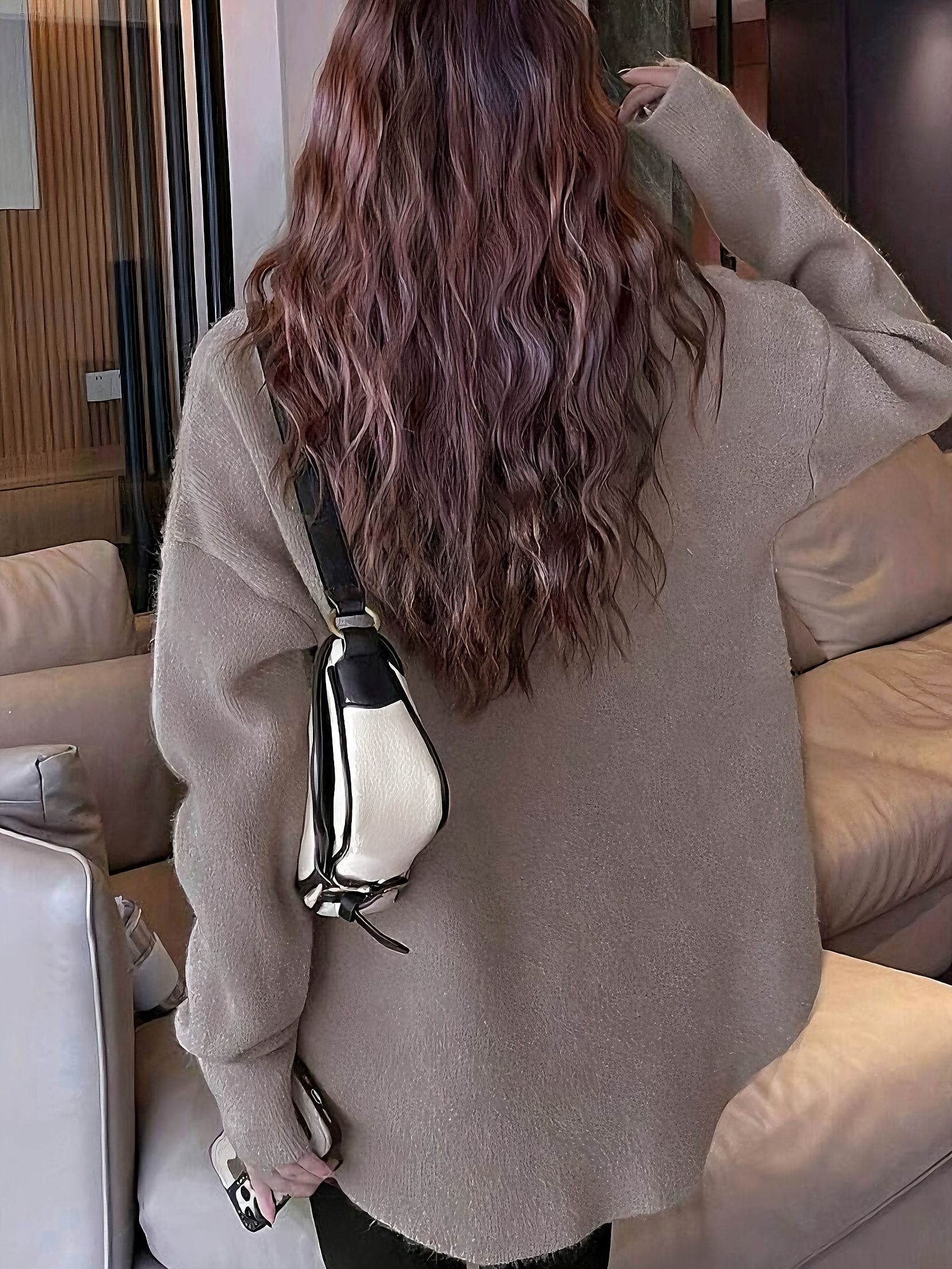 Plus Size, Women's Elegant Oversized Beige/Brown Sweater Coat - Soft Round Neck Collar Pullover, Winter Warm Blazer-like Jacket for Casual & Professional Wear, Hand Washable Fall/Winter Outerwear (No Pattern)