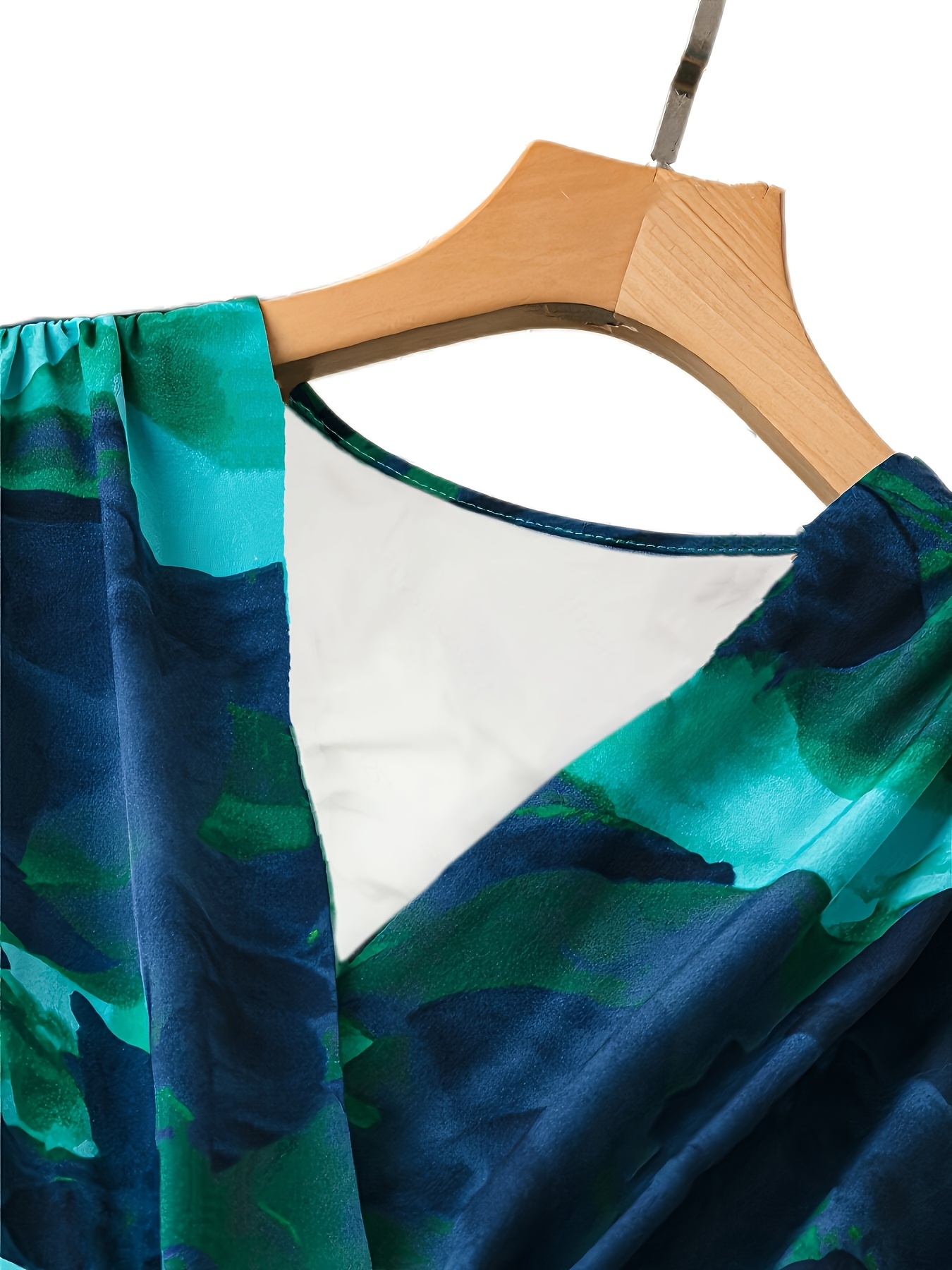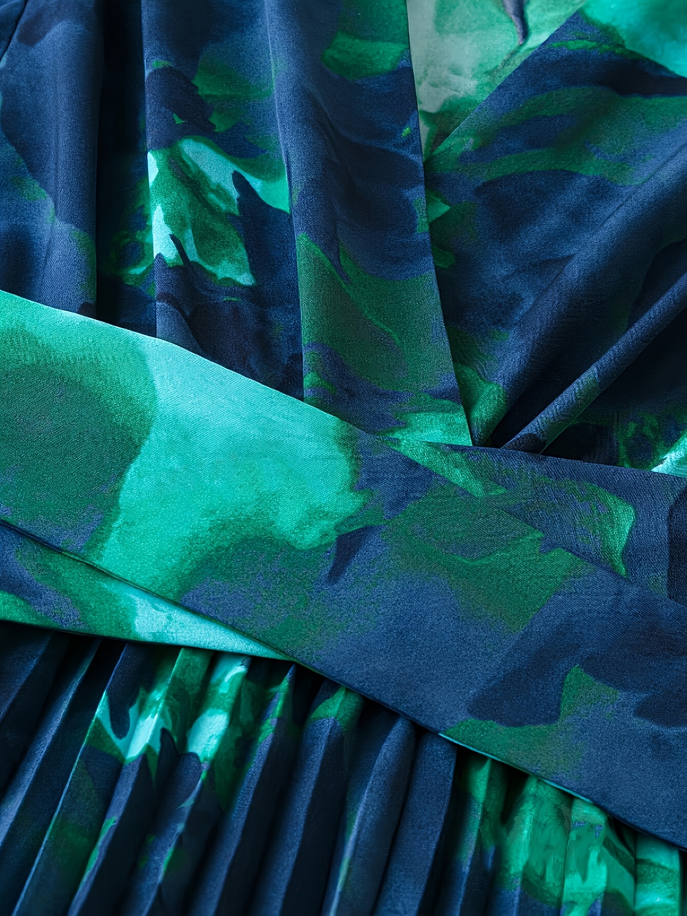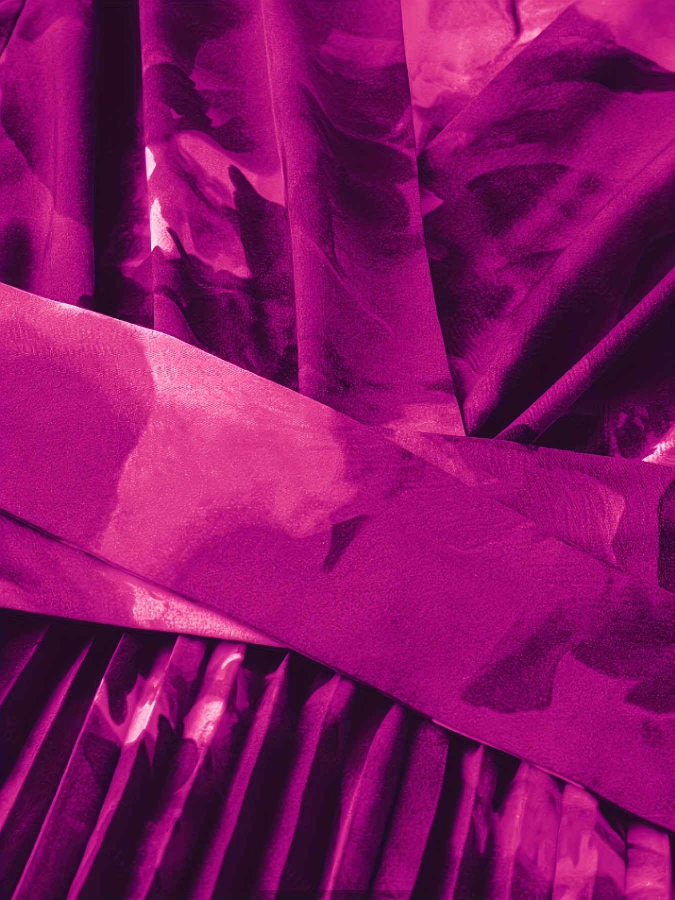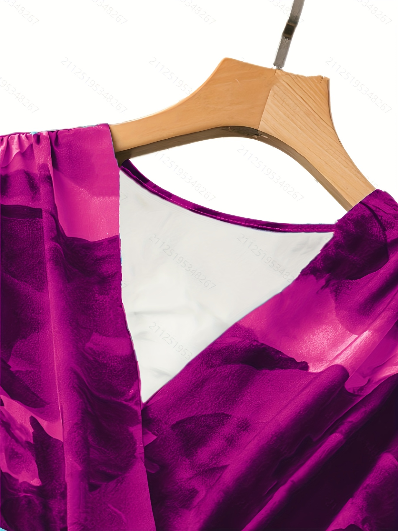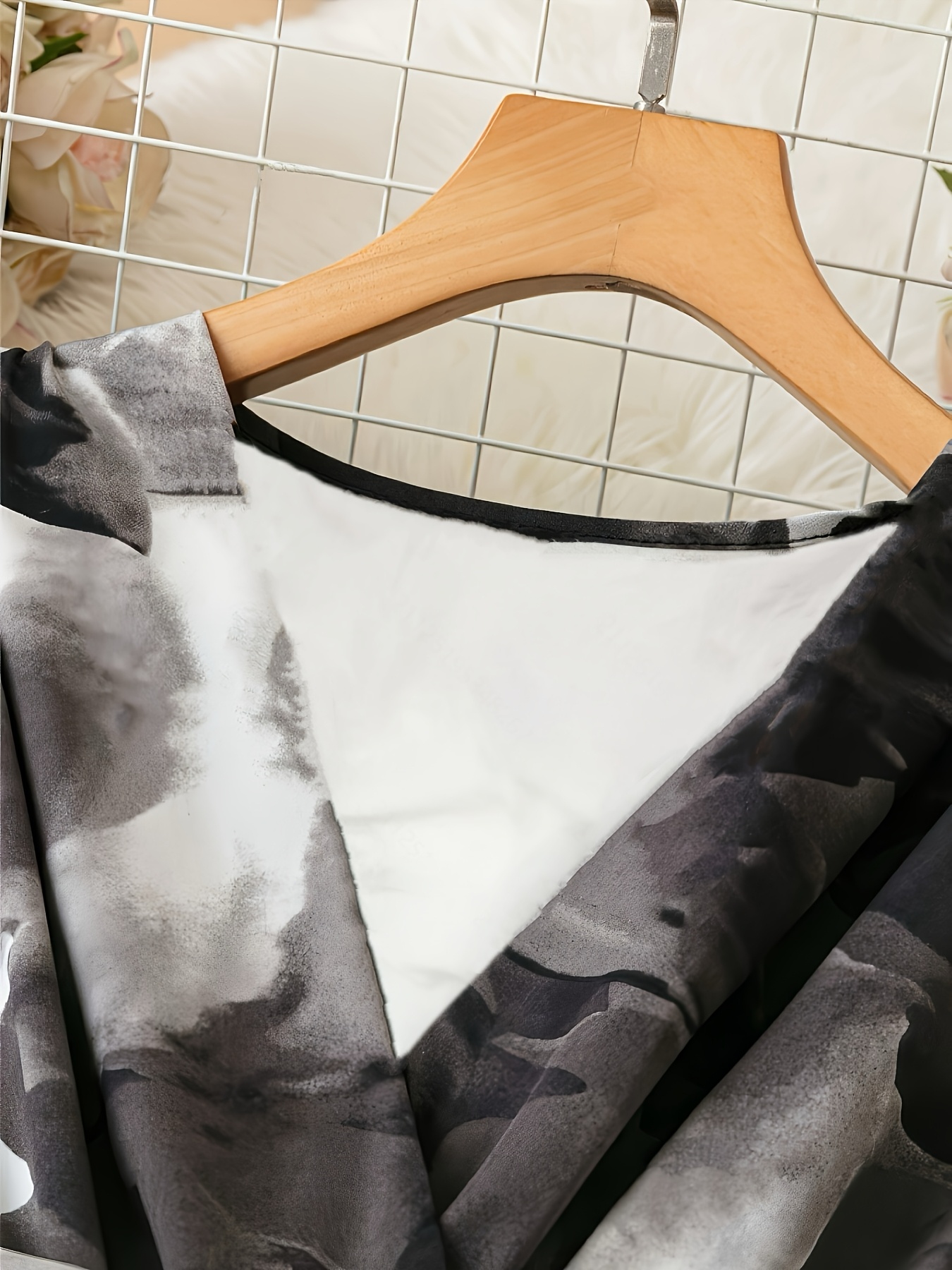 Elegant V-Neck Short Sleeve Floral Print Pleated Dress with Belt - Polyester, Black/White/Gray, Spring/Autumn, Casual & Semi-Formal Occasions, Cute Dresses