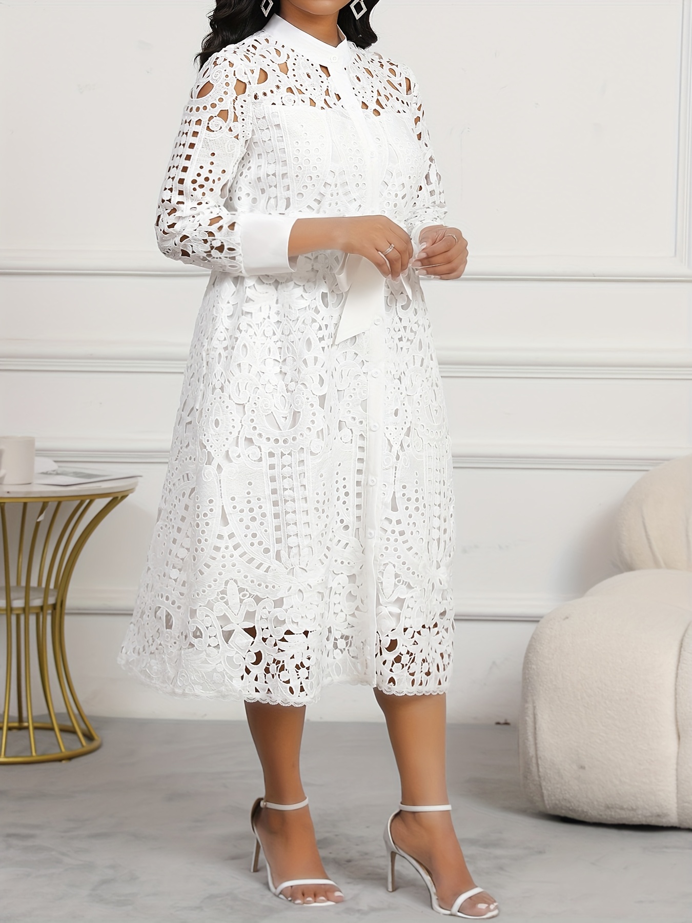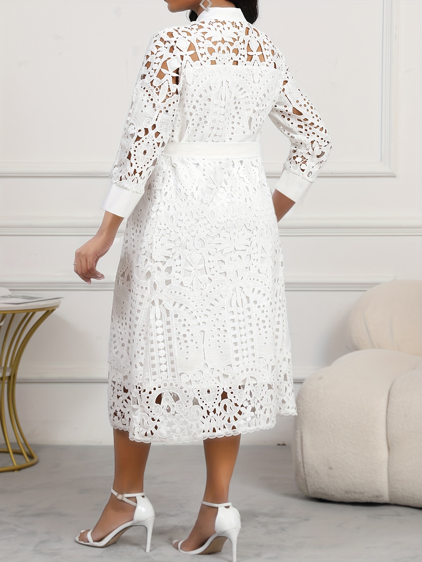 Elegant White Lace Midi Dress with 3/4 Sleeves and Belt Detail, Button-Up Front, Breathable Fabric, Perfect for Casual or Semi-Formal Occasions, Lace Dress, Occasion Wear, Nontransparent Fabric
