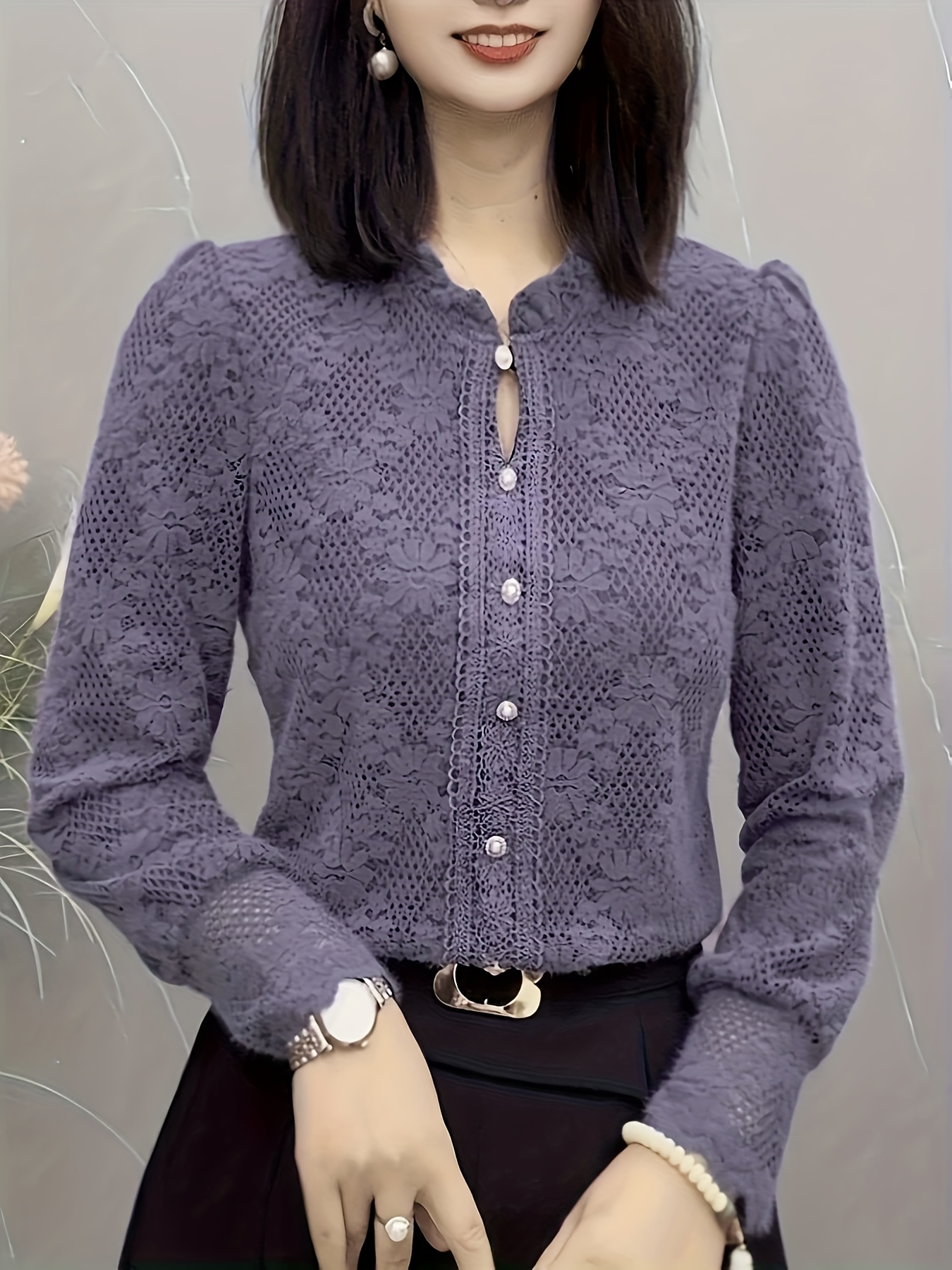 Plus Size - 1pc Elegant Lace Trim Long Sleeve Blouse for Women - Chic Round Neck, Non-Stretch Fabric, Floral Pattern, Perfect for Spring/Fall, Versatile Layering Piece, Spring Fashion Top | Floral Pattern Top | Nonstretch Material