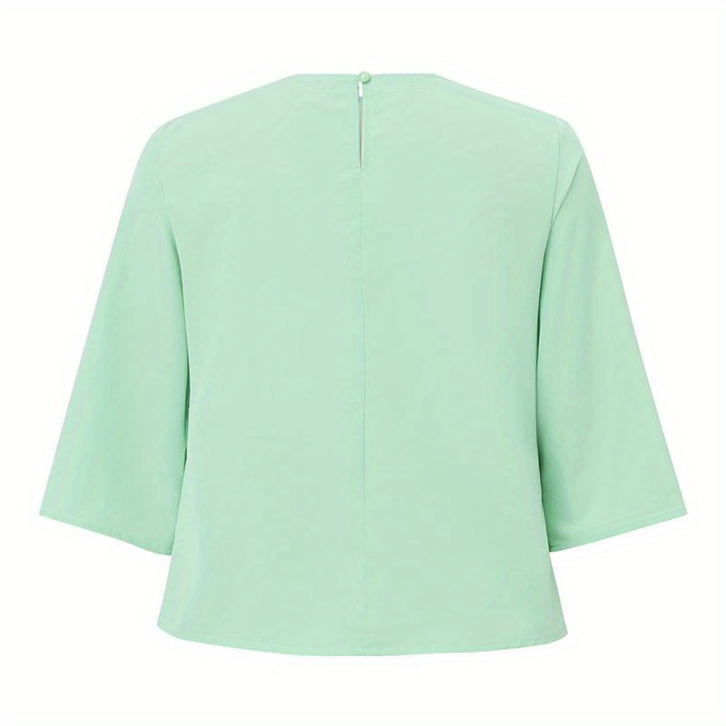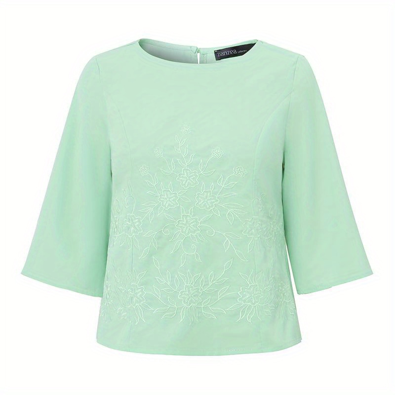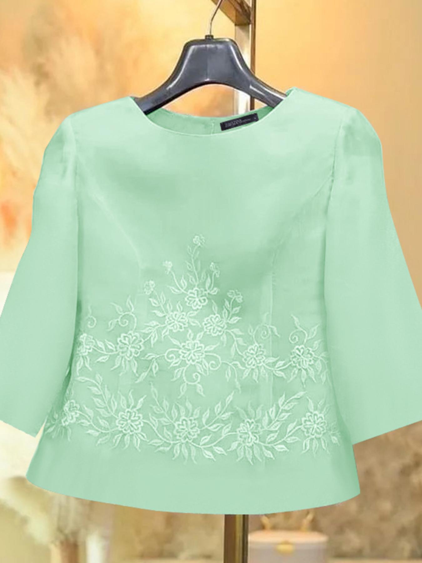 [Plus Size Embroidery Tops] Plus Size Elegant Embroidery Tops | Women's Short Sleeve Crew Neck Baggy Shirt | Summer Commuter Holiday Lightweight Casual Blouse