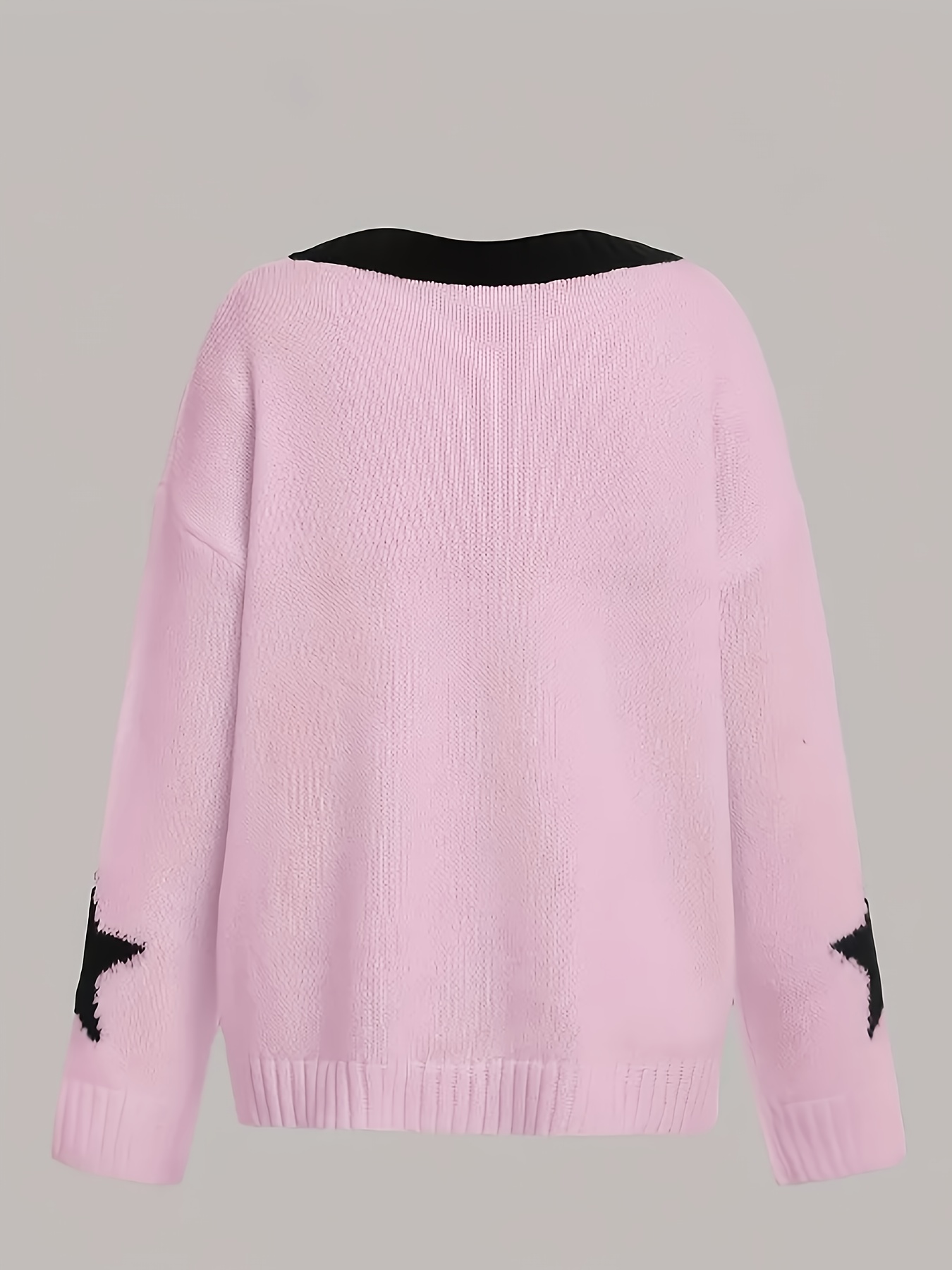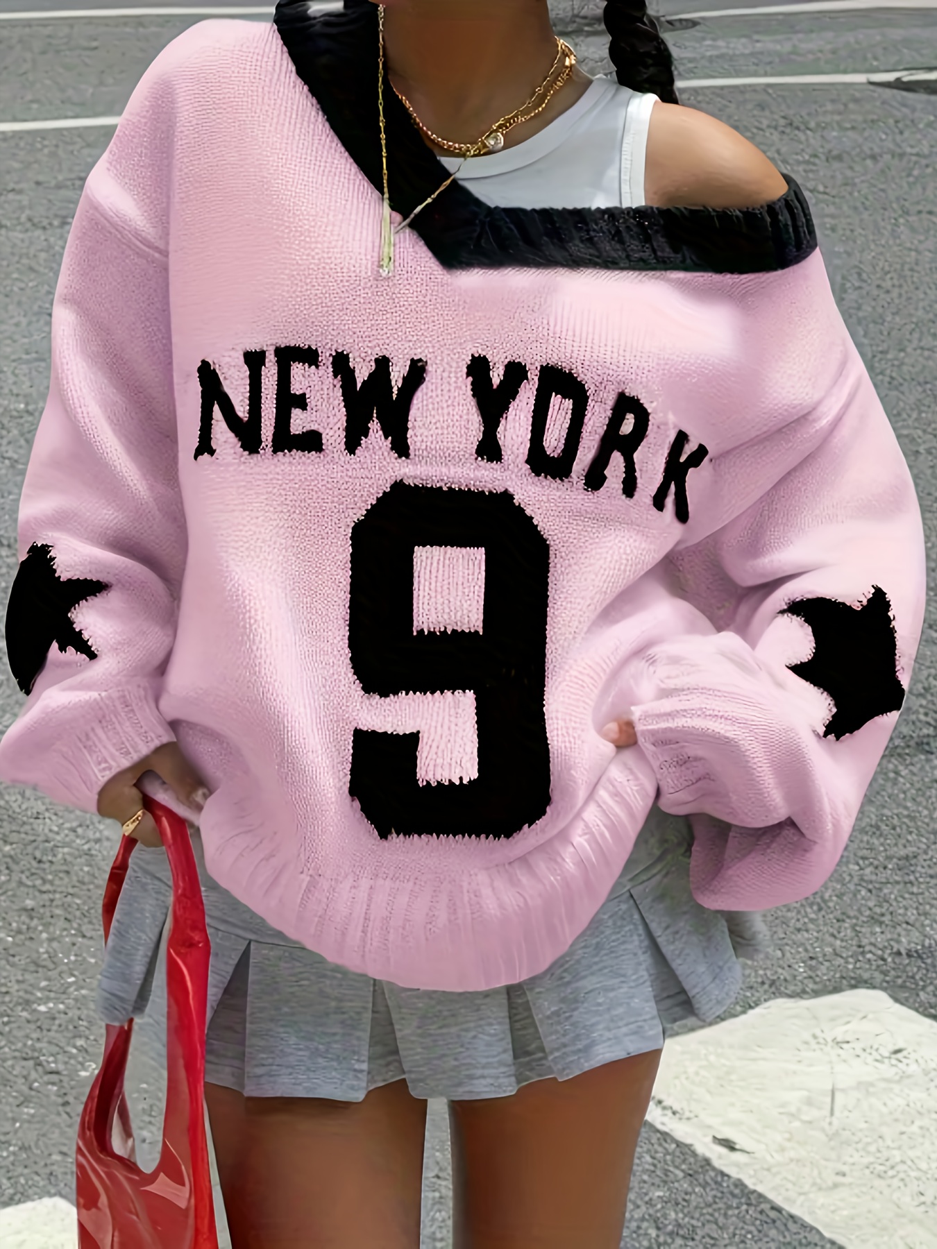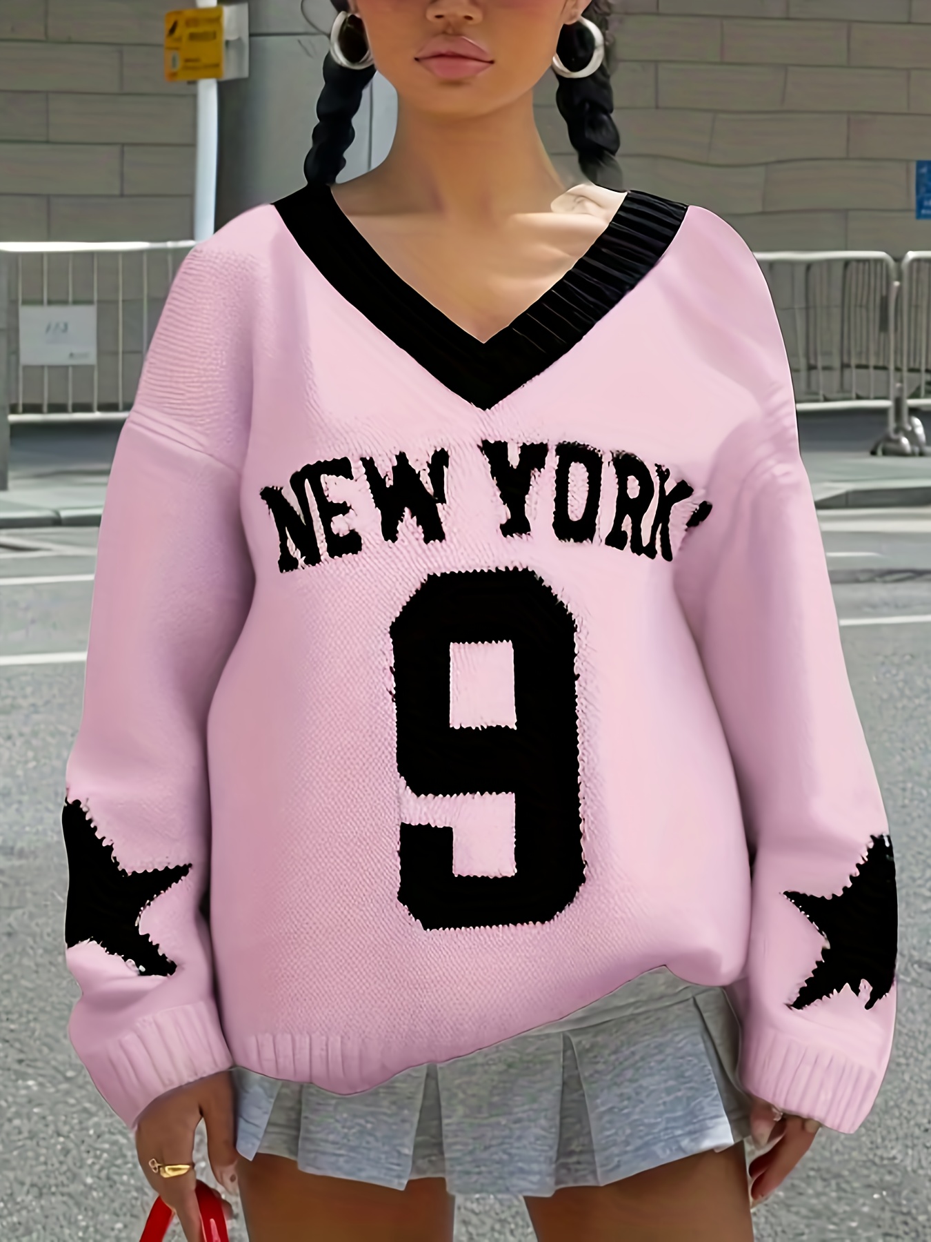 Plus Size, Plus Size Women's Oversized V-Neck Sweater - & Number 9 Print Pink Sweater with Logo-Like Lettering, Cozy Winter Sweater for NYC-Themed Outfits, Casual Elegant Hand Washable Fall Winter Sweeping Collar Sweater