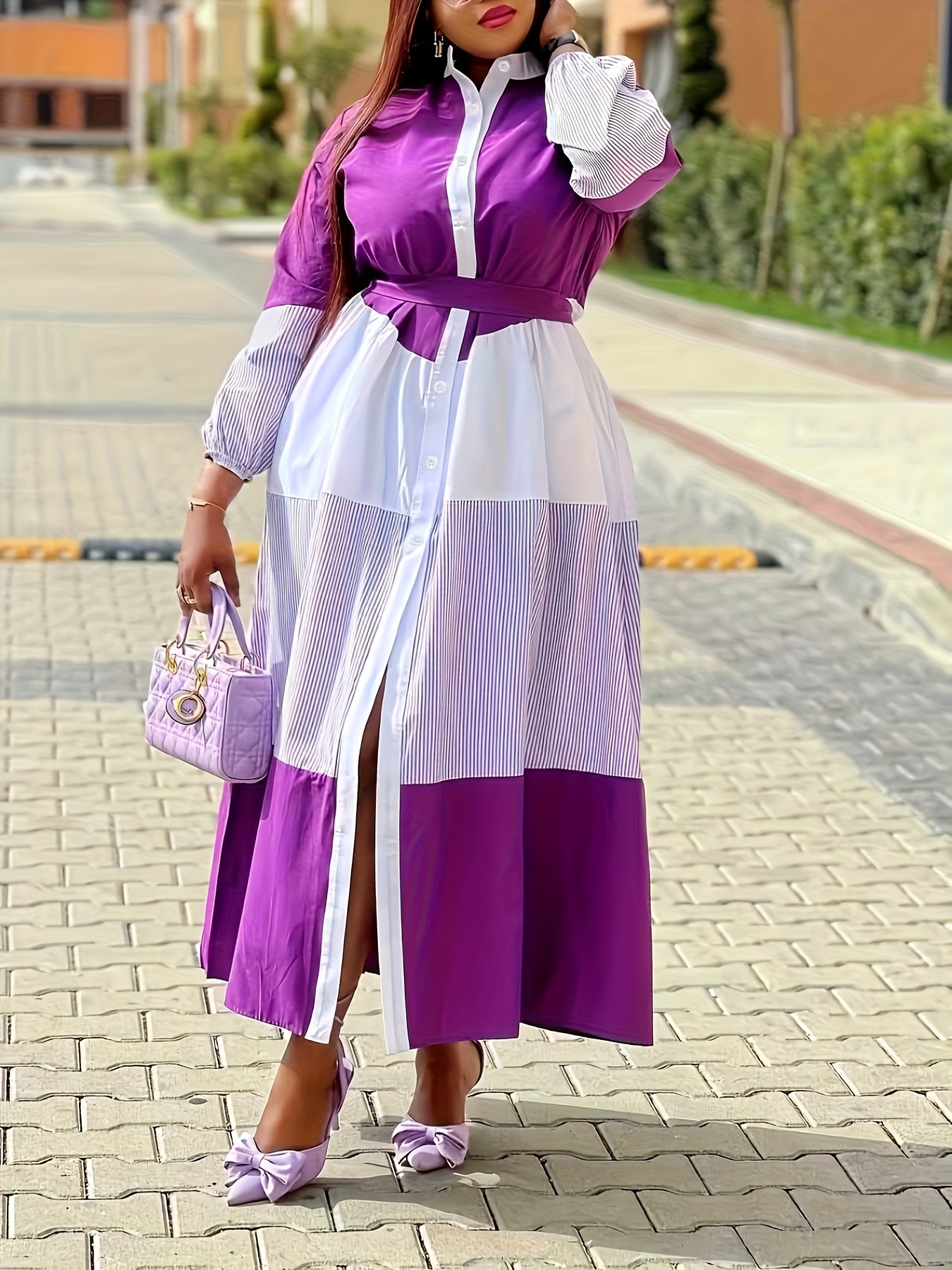 Plus Size - Plus Size, Women'S Plus Size Elegant Long Sleeve dress - Formal & Casual office to party Outfit, Button-Front Long Dress in Olive Green & White Vertical Stripes, Non-Stretch Fabric for Everyday & Special Events, Versatile Wardrobe Staple, Classic Round Neckline, Structured Silhouette, Stylish Blouse Dress, Professional Women