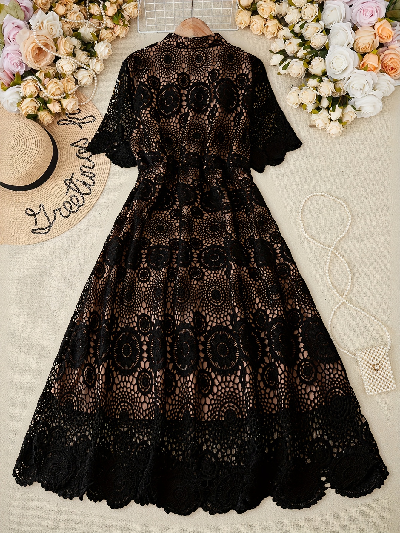 Plus Size, Women's Elegant Short Sleeve Round Neck Lace Detail A-Line Midi Dress with Button Front Closure & Elastic Waist - Machine Washable Solid Color Plus Size Party & Casual Dress