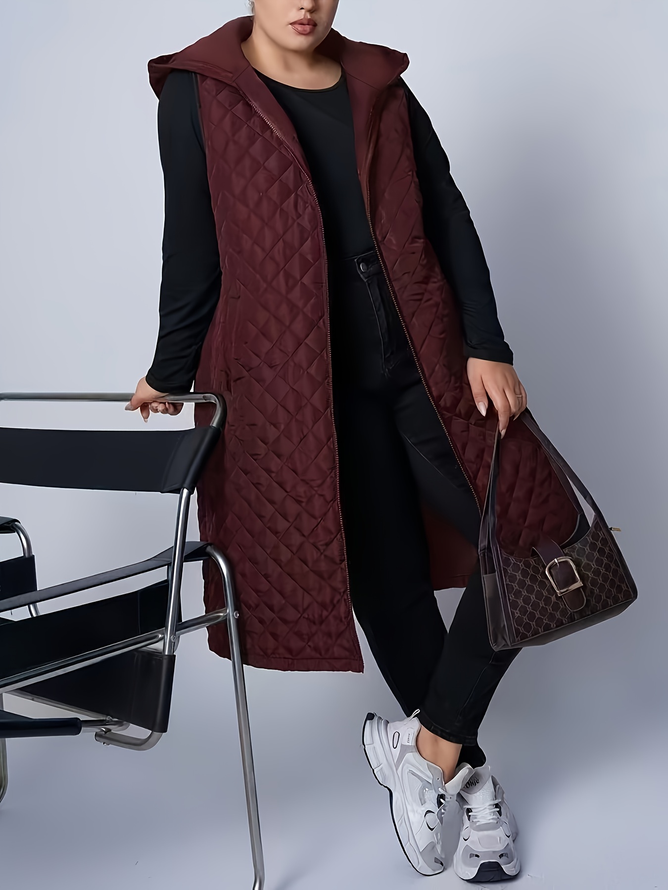 Plus Size, Women's Oversized Burgundy Hooded Vest - Thickened Long Sleeveless Coat with Full-Zip Closure, Machine Washable Winter Warmth, Elegant Casual to Formal Outerwear for Fall & Winter (Plus Size Available) - Solid Burgundy Coat for Women, Knee-Length Design, Relaxed Fit, Chic Hooded Style, Versatile Layering Piece for Casual Attire, Winter Vest for Women Plus Size, Plus Size Coats, Sleeveless Jacket for Women, Womens Curve Winter Vest, Vest for Women Winter