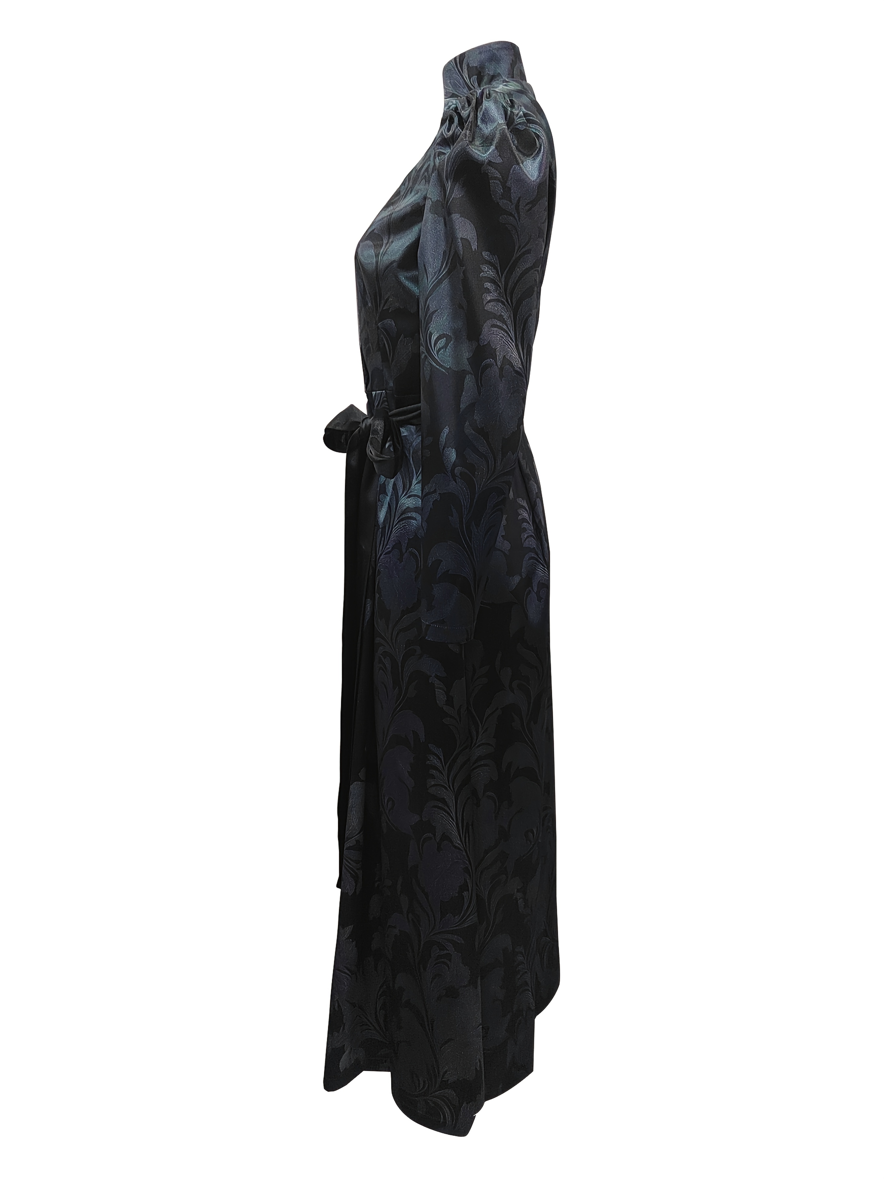 Plus Size, Women's Plus Size Black Floral Jacquard Satin Long Sleeve A-Line Stand Collar V Neck Dress